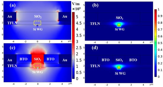 A common approach to modulator design is to have the gap between the electrodes and the waveguide completely covered by SiO2 [21], which is categorized as a cladding configuration with a low relative dielectric constant. In order to facilitate a comparison of the effects of low- and high-dielectric-constant cladding, the electric field intensity distribution and optical field distribution were calculated for both structures under identical parameters. Both structures adopted signal electrodes with a width of 20 µm and ground electrodes with a width of 100 µm. For SiO2 cladding, the parameters were hAu = hSiO₂ = 1.5 µm and G = 7 µm. In the case of BTO cladding, the BTO layer had a thickness of 1.5 µm and a width of 2 µm, while maintaining the same values of hAu = 1.5 µm, hSiO₂ = 1.5 µm, and G = 7 µm as the SiO2 structure. An additional geometric parameter, wSiO₂ = 3 µm, was introduced in the BTO cladding structure. Figure 3a,c show the electric field distributions under a 1 V applied voltage. In the low-dielectric-constant cladding modulator, the relative dielectric constant of SiO2 is considerably lower than that of TFLN, resulting in the electric field concentrating within the SiO2 cladding and remaining weak within the TFLN waveguide. In contrast, the modulator with BTO cladding reduces the field strength in the cladding due to its high dielectric constant, while significantly enhancing it in the LN waveguide. This is explained by Gauss’s law, where the electric field satisfies Maxwell’s equations at boundaries with differing ε, as follows: