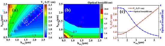Since the gap variation monotonically affects modulation efficiency and optical loss, it does not alter the trend observed with the BTO cladding. Therefore, we fixed the electrode gap at 7 µm in simulations to determine how changes in the size of the BTO cladding structure affect modulation efficiency and optical loss. With the wSiO₂ fixed at 3 µm, the modulation efficiency and the metal absorption loss, with variation in the heights of SiO2 (hSiO₂) and BTO (hBTO) within the range from 0.5 to 2.5 µm, were calculated, as depicted in Figure 5a,b, respectively. It was found that a lower Vπ·L could be achieved when hSiO₂ ≈ hBTO ≥ 1.5 µm. Furthermore, the propagation loss could also be realized to be less than 1.6 dB/cm. Considering the challenges associated with depositing thick BTO cladding layers, where achieving greater thickness currently requires extended deposition time at the expense of production efficiency, we intentionally selected hSiO₂ = hBTO = 1.5 µm as a representative case to investigate the structural dependence. This thickness value serves as a practical compromise between device performance and fabrication feasibility. Based on this thickness configuration, taking the case of hSiO₂ = hBTO = 1.5 µm as an example, the impact of wSiO₂ on the modulation efficiency and metal absorption loss is also shown in Figure 5c. Here, the wSiO₂ is varied between 1.0 and 5.5 µm, and the width of BTO on both sides of the cladding layer is in one-to-one correspondence with the width of SiO2, namely, wBTO = (G − wSiO₂)/2. It can be observed that Vπ·L can reach a low point of 1.39 V∙cm, with a propagation loss of 3.2 dB/cm, when wSiO₂ = 1.9 µm.