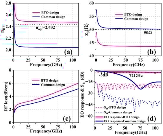 A comparative simulation was conducted using ANSYS HFSS to verify that the proposed model achieves improved bandwidth performance compared to common designs. When the characteristic impedance of the common design model amounts to 50 Ω and nRF is maximized to the greatest extent possible, the bandwidth of the BTO design model with the identical electrode dimensions is contrasted. At this point, ws = 20 µm, hAu = 1 µm, hSiO₂ = 1.5 µm, and G = 7 µm, and the phase shifter arm length L = 10 mm. The ground electrodes are five times the width of the signal electrode, as this configuration in the CPW electrode reduces dispersion and minimizes radiation loss. The simulated RF effective index (nRF), the RF loss, and the characteristic impedance (z0) are depicted in Figure 6a–c, respectively. The nRF value of the modulator with BTO is approximately 2.46, which is essentially the same as the optical group index (nopt = 2.432). However, the nRF value of another modulator is approximately 2.04, resulting in a velocity mismatch. The characteristic impedance of the BTO cladding modulator is marginally lower than 50 Ω. Additionally, both modulators show high similarity in RF loss, indicating that the presence of BTO does not significantly impair RF loss. Furthermore, the EO response and electrical reflections (S11) were calculated over a wide frequency range. Theoretically, the bandwidth of the EO response can be calculated by the following equations [26]: