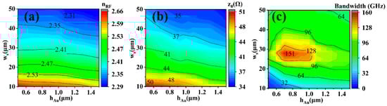 In order to achieve a broader 3 dB EO bandwidth, the parameters of the electrode size were optimized. Additionally, altering the thickness and width of the electrode had no influence on the modulation efficiency and optical loss. Figure 7a,b presents contour maps of nRF and z0 as a function of the signal electrode width ws and the thickness hAu. The modulator parameters are set as wSiO₂ = 1.9 µm, G = 7 µm, hBTO = hSiO₂ = 1.5 µm, and a phase shifter arm length of L = 10 mm. The RF effective index decreases as the signal electrode width or thickness increases. Similarly, the characteristic impedance decreases as the signal electrode width or thickness increases. It can be found that a broad 3 dB EO bandwidth of >150 GHz can be achieved when hAu = 0.7 µm and ws = 28 µm. This approach has the capability of achieving an operating voltage of less than 1.5 V and high-speed modulation up to 150 GHz.