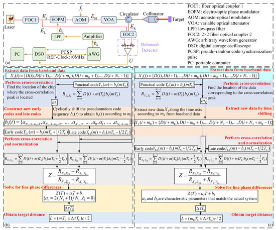 A schematic of the coherent ranging system, which is phase-modulated by a pseudo-random binary code, is illustrated in Figure 1a. Fiber optic coupler 1 (FOC1) divides the laser into two parts: the signal and the local oscillator . The signal is phase-modulated with the pseudo-random code using an electro-optic phase modulator (EOPM). An acousto-optic modulator (AOM) is used to shift the frequency of the signal by a specified amount . Finally, the frequency-shifted signal is transmitted through a variable optical attenuator (VOA) and a collimator. The backscattered signal from the target and local oscillator are optically mixed using a 2 × 2 fiber optic coupler 2 (FOC2), leading the coherent light to a balanced detector, where it is converted into an electrical signal of intermediate frequency (IF). The pseudo-random code is generated by an arbitrary waveform generator (AWG), which produces a pseudo-random code synchronization pulse (PCSP) at the beginning of each pseudo-random code sequence to be fed into the acquisition module. The acquisition module is a digital storage oscilloscope (DSO), which samples the IF electrical signal triggered by the PCSP. Subsequently, the sampled data are processed on a computer to determine the distance and velocity of the target. The reference output clock (REF-Clock) of the DSO serves as the reference clock for the AWG to ensure that the transmission and reception of the system are synchronized.