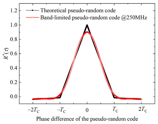 where is the transfer function of the LPF. Figure 2 shows the correlation functions of the theoretical pseudo-random code and the pseudo-random code with a bandwidth of 250 MHz. As shown in Figure 2, the correlation function of the theoretical pseudo-random code is a triangle. The LPF changes the correlation function of the pseudo-random code, and the correlation function of the band-limited pseudorandom code is no longer a triangle. Therefore, the early–late discriminant models of pseudo-random codes with different bandwidths are also different. The actual ranging system is band-limited, and the devices used in the system are not ideal. When the theoretical phase discrimination model is applied to the actual ranging system, it can result in ranging deviations that decrease the accuracy of the ranging. Therefore, the characteristic parameters of the early–late discriminator model need to be calibrated to improve the ranging accuracy.