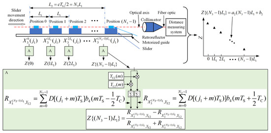The proposed methodology initially employs this ranging system to establish a characteristic parameter calibration system with variable time delays. It calculates the value for different time delays, where the actual time delay interval is less than the ADC sampling period . This principle is depicted at the top of Figure 3. The position of the sampling point of the DSO in the chip is changed by adjusting the retroreflector position, which effectively changes the phase of the sampled data. Within the distance corresponding to the sampling period, the retroreflector steps forward each time for a total of steps. The pseudo-random code synchronization pulse and the target echo are sampled simultaneously at each position, and cycles of pseudo-random code are sampled. A pseudo-random sequence of length is extracted at each position from the target echo data , where is aligned with . The mean value of at each position is computed. By performing a least squares fitting on sets of data , one can derive the characteristic parameters and of the phase discrimination model that matches the actual ranging system, as shown in the upper right area of Figure 3. During the ranging process, the peak position is obtained using the cross-correlation method, and the data of length are obtained according to . is obtained by performing the cross-correlation operation and normalization operation on , , and according to Figure 1c. The phase difference is inversely calculated by taking into the phase discrimination model . The final distance of the target is .