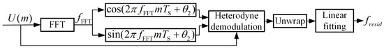Figure 4 depicts the procedure for determining the velocity. Initially, a fast Fourier transform (FFT) operation is performed to obtain the frequency . The local orthogonal digital waveforms and are then constructed according to , where is the initial phase. Next, heterodyne demodulation and phase unwrapping are conducted on to derive the phase data , along with the residual frequency difference and the residual phase . Subsequently, curve fitting is performed on the phase data to determine the residual frequency . The speed of the target is expressed as , where represents the wavelength of the light wave.