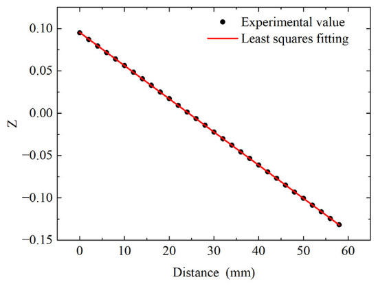 Each step distance of the retroreflector was 2 mm, corresponding to a time delay interval of ps, which was equivalent to re-interpolating a sampling period into 30 data points. Each distance value and its corresponding value are plotted as the black dots shown in Figure 5. Using least squares fitting, the characteristic values and were obtained, where the R2 (coefficient of determination) value and the sum of the squared residuals indicated a highly accurate fit, confirming that the model was credible. The characteristic parameters of the theoretical phase discrimination model used in the traditional method were and , which differed from the characteristic calibration parameters. The necessity of the calibration process can be fully explained by a comparison to the subsequent distance measurement results.