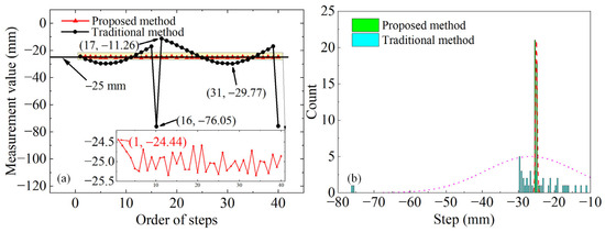 Measurement results of 40 steps of 25 mm. (a) Ranging accuracy. (b) Histogram of ranging results.