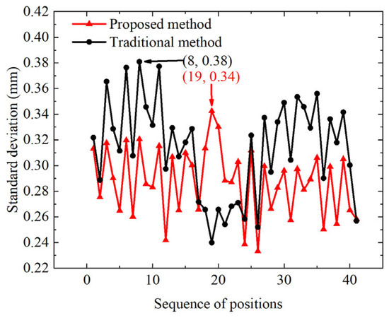 Figure 7 shows the standard deviations of the distance measurements at the 41 positions, indicating that the ranging precisions of the two schemes were comparable. The maximum standard deviation (1σ) of the proposed method was 0.34 mm, which corresponded to a time-delay precision of 1.13 ps. The ranging precision (1σ) of the traditional method was 0.38 mm.