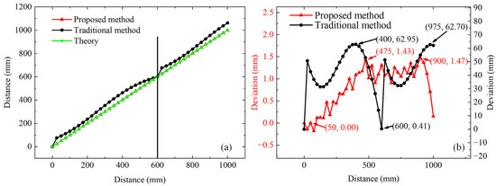 Figure 8 shows the cumulative distance measurement results for the 40 steps. Because of the limited length of the guide rail, the range of motion for the retroreflector was restricted to 1000 mm. Figure 8a shows the theoretical distance set by the control terminal of the guide rail, along with the mean values of the distances measured using both the traditional and proposed methods. Figure 8b shows the deviations between the mean measurements of the distances and the theoretical distances. An analysis of Figure 8 revealed that the traditional ranging method exhibited a maximum measurement deviation of 62.95 mm and a minimum deviation of 0.41 mm. Furthermore, the measurement deviation exhibited a periodic pattern with a period of 600 mm, which corresponded to the width of the chip of 4 ns. In contrast, the proposed method exhibited an increasing trend in the measurement deviations within the 0–500 mm range but stabilized in the 500–1000 mm range, with a minimum deviation of 0.00 mm and a maximum deviation of 1.47 mm.