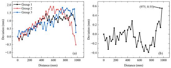 Three groups of measurements of the distance of the stationary target. (a) The three groups of measurements. (b) Deviations after subtracting the average of the three groups of measurements.