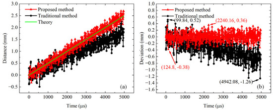 The retroreflector was set to move at a uniform speed of 500 mm/s. Limited by the storage depth of the DSO, the retroreflector was measured continuously for 5 ms. Figure 10 shows the results of the distance measurements for the moving target. In Figure 10a, the red triangles represent the distance measurements obtained using the proposed method, the black dots represent the distance measurements obtained using the traditional ranging method, and the green line represents the theoretical distance. Figure 10b shows the deviations between the measured and theoretical distances. The maximum ranging deviations for the proposed and traditional methods were −0.38 mm and −1.26 mm, respectively. Additionally, as the target distance increased, the ranging deviation of the traditional method reached a maximum, following the trend of the black dots shown in Figure 8b, with a periodicity of 600 mm. The ranging precisions (standard deviations) of the proposed and traditional methods were 0.13 mm and 0.20 mm, respectively. Compared to the static ranging results presented in the previous section, the ranging accuracy of the proposed method for the moving target was lower than that for the static target because random phase fluctuations occurred between the sampling clocks of the DSO and AWG when the DSO was triggered to sample the data, which disrupted the synchronization between the clocks.
