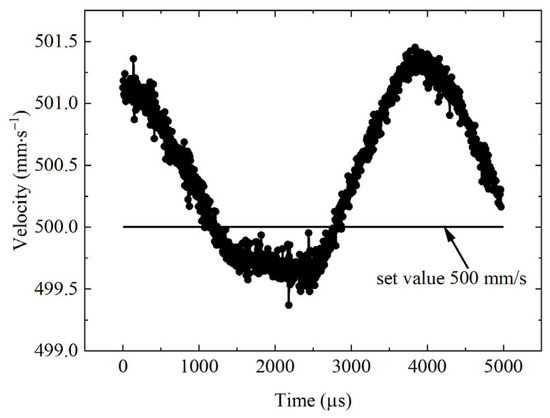 While measuring the distance to the moving target, the proposed method also calculated its velocity. Figure 11 shows the velocity measurements. The average value of the target velocity was 500.44 mm/s, with a deviation of 0.44 mm/s from the set value. The precision (1σ) of the velocity measurement was 0.58 mm/s.