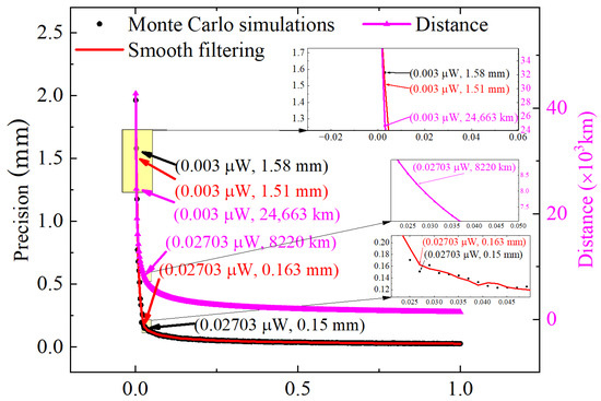 where is the heterodyne efficiency, is the responsivity, is the received optical power, is the electron charge, and is the receiver bandwidth. A Monte Carlo simulation was conducted to analyze the relationship between the received optical power and the ranging precision. The results are depicted as black dots in Figure 12. Additionally, the pink curve in Figure 12 shows the correlation between the received optical power and the range. Figure 12 illustrates that in the shot noise limit, the optical power decreased as the ranging precision increased with distance. The ranging precision deteriorated sharply at an optical power of 27 nW. Here, 27 nW of optical power corresponds to a distance of 8220 km, with a ranging error of 0.15 mm and a time delay error of 0.5 ps. When the received optical power was 3 nW, the corresponding distance was 24,663 km, with a ranging error of approximately 1.51 mm and a time-delay error of approximately 5.03 ps.