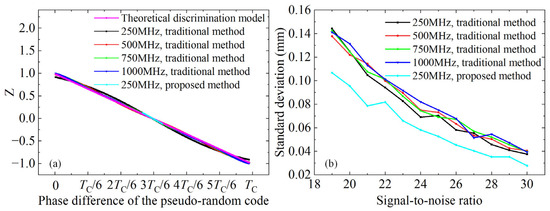 The theoretical waveform of the pseudo-random code is a rectangular wave, its spectrum is infinite wide, its main energy is concentrated in the main lobe, and its theoretical phase discrimination model Z is a linear model, as shown in Figure 13. The bandwidth of the actual ranging system is limited, and the devices used in the system are not ideal. These factors lead to a poor matching between the theoretical phase discrimination model and the actual system. When the theoretical phase discrimination model is used in the actual system, it will bring errors. Figure 14a simulates the relationship between the phase discrimination model and the bandwidth. When the bandwidth becomes small, the phase discrimination model moves away from the theoretical phase discrimination model, and when the bandwidth becomes large, the phase discrimination model approaches the theoretical model. When the system bandwidth is infinitely wide, the phase discrimination model is equal to the theoretical model. As shown in Figure 14a, there is a difference between the phase discrimination model of the band-limited system and the theoretical model. When the theoretical model is applied to a system with limited bandwidth, it results in a decrease in the ranging accuracy. Figure 14a also illustrates the theoretical relationship between the ranging accuracy and ranging range in the traditional method. The phase discrimination range of the pseudo-random code is , corresponding to a chip width, which leads to the ranging accuracy periodically improving and deteriorating as the ranging range increases. When the system bandwidth is equal to one times the chip rate, the ranging accuracy of traditional method becomes very poor within the period, and as the system bandwidth continues to increase, the ranging accuracy of traditional method will gradually improve within the period. Figure 14b simulates the relationship between ranging accuracy, bandwidth, and SNR. In Yu’s article, the SNR for ranging is greater than 21 dB [19]. For comparison, we simulated the variations in ranging accuracy when the SNR is greater than 20 dB. The main energy of the pseudo-random code is concentrated within the main lobe. As the system bandwidth increases, the discrimination model approaches the theoretical discrimination model, improving the ranging accuracy. However, the SNR decreases, leading to a deterioration in the ranging precision, as shown in Figure 14b. This issue is inherent in the traditional method, where the accuracy and precision of the distance measurement are mutually restrictive. This also explains the ranging precision of 0.33 mm and the ranging accuracy of 6 mm mentioned in Yu’s article. The method proposed in this paper reduces the system bandwidth, ensures a high SNR, and improves the ranging accuracy using a discriminator with calibrated characteristic parameters so that the ranging accuracy does not show periodic variations as the ranging range increases. By employing a data-shifting method, the consistency of the discriminator in ranging is maintained. Compared with the traditional method, the proposed method improves the ranging accuracy and ensures a high ranging precision, which solves the situation that the ranging accuracy and ranging precision constrain each other. This is the difference between the proposed method in this paper and the method in Yu’s paper.