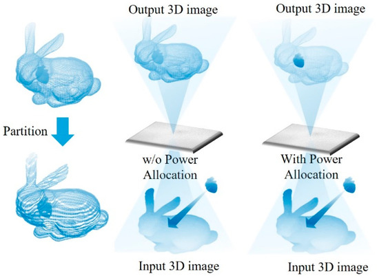 In VLC systems, it is essential to accommodate the diverse optical power demands of users who utilize different communication devices and engage in varied applications. To optimize resource utilization and minimize optical power wastage, the VLC system should be capable of dynamically allocating power among users. Conceptually, this allocation process can be likened to projecting an image of users onto different imaging plates, each situated at unique locations. For example, as shown in Figure 2, the little bunny object has been partitioned into multiple layers to create multiplexing holograms. By employing power allocation holography, we can enhance the heart region of the projected image.