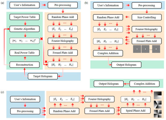 where and respectively represent the spatial electrical field distribution on SLM. Assuming the electrical fields and of two users are added as different random phase vectors and , the resulting holograms can be expressed as