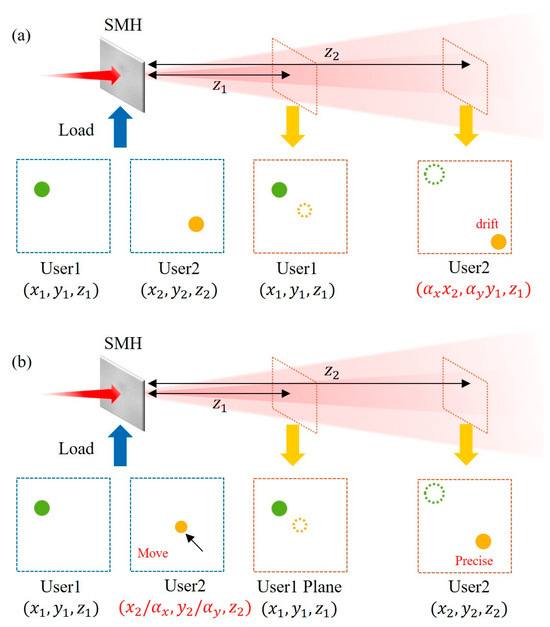 The creation of SMH for effective power allocation is depicted in Figure 3. A significant challenge in this process is the beam’s diffraction transmission, which results in the expansion of the light plane and potential drift of the target position as the transmission distance increases [19,20]. To mitigate this issue during the preprocessing stage, it is imperative to precisely sample the transmission space as shown in Figure 4. The source plate is defined as an SLM plate, characterized by a bilateral pixel count of and an initial pixel pitch of . The pixel intervals at a distance from the source, as determined by Fresnel diffraction, are and for horizontal and vertical directions, respectively. Consequently, the light field’s horizontal and vertical magnification factors, and , can be computed. For a given user located at position , these magnification coefficients are initially calculated based on the distance . Thus, the target’s position within the source field can be accurately described as and .