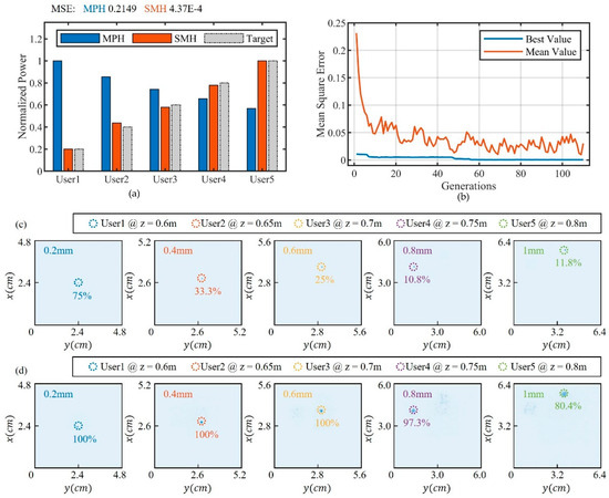 Following the methodology outlined in Section 2.1, the SMH for a five-user VLC system is successfully generated. The convergence line of GA during optimization is illustrated in Figure 5b. The population size is set to 100, with a migration factor of 0.5. The normalized central power for each user, as depicted in the bar chart of Figure 5a, demonstrates the efficacy of the SMH in terms of power distribution.