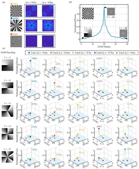 In terms of secure communication, the users’ information undergoes dual encryption following the principles outlined in Section 2.3. Firstly, as shown in Figure 6a, we demonstrate the dispersion resistance and arbitrary location OAM-forming ability of SMH. We created 5th- and 10th-order OAM multiplexing holograms using SMH, the conventional SDM method [17], and the MDM method [16]. The SDM method splits the forward space and forms two OAM modes in different directions, but the depths of the two OAM modes are similar, and their locations change as the distance increases. In the MDM method, two OAM modes are coaxially added, and users can only decode the signal at the same place. In contrast, SMH forms the two OAM beams at 0.6 m and 0.8 m, respectively, with smaller rings, indicating minimal dispersion. This highlights the superiority of SMH. Then, Figure 6b illustrates the relationship between power variation and OAM keys to highlight the critical role of accurate OAM decoding. Specifically, for user encoded with OAM modes l = 20, only the application of the inverse OAM phase l = −20 yields maximal power reception. Moreover, the power reception quality incrementally improves as the decoding OAM modes more closely align with the correct values. This is because light spots decoded with OAM modes closer to the correct value tend to assume a Gaussian distribution.
