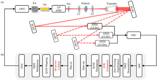 The enhanced signals are directed into a laser diode mount (Thorlabs LDM9T/M, Thorlabs, Newton, NJ, USA), which is integrated with temperature-electric coolers (TECs) and controllers. A 638 nm laser diode (Mitsubishi, ML501P73, Tokyo, Japan) is employed to generate the visible light signals. These signals undergo polarization adjustment via a polarizer (insertion loss 0.03 dB @ 632 nm) to ensure compatibility with the spatial light modulator (SLM, Meadowlark, 1920 × 1200 XY Phase Series, insertion loss 1 dB @ 632 nm, Meadowlark Optics, Frederick, MD, USA). After polarization, the light is focused through a lens onto a 50 μm diameter pinhole, serving to eliminate extraneous spatial modes. Subsequently, the light is expanded by the 4-f system (total insertion loss ≈ 3 dB @ 632 nm) to increase the light spot size.