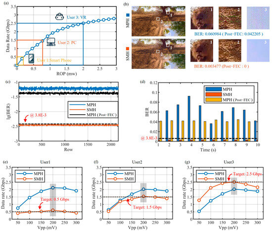 Figure 8e–g present the data rate curves for different users as a function of the waveform voltage (peak-to-peak voltage, Vpp) of the signals. All users achieved their highest data rates at a Vpp of 200 mV. This pattern is characterized by an initial increase followed by a decline after reaching the peak, attributable to the non-linear effects inherent in the transmission and reception equipment. This trend underscores the critical balance required between signal strength and the limitations imposed by system non-linearities. The graphs also delineate the performance comparison between the SMH and MPH methods in terms of achieving target data rates: 0.5 Gbps for User 1, 1.5 Gbps for User 2, and 2.5 Gbps for User 3. It is evident that users under the SMH approach closely match their respective target data rates, demonstrating the method’s effective power allocation and reduced disparity. Conversely, the MPH method exhibits significant power mismatch, failing to meet the targeted data rates across the user spectrum.