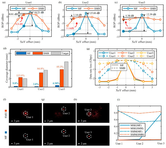 Experimental results for power coverage. (a) User 1’s ROP trend with XoY offset; (b) User 2’s ROP trend with XoY offset; (c) User 3’s ROP trend with XoY offset; (d) Coverage area diameter of 3 users under MF and SMH; (e) Data rate trend with XoY offset of three users; (f) CCD recording at User 1’s plate under different methods; (g) CCD recording at User 2’s plate under different methods; (h) CCD recording at User 3’s plate under different methods; (i) MSE and SSIM of recordings under different methods.