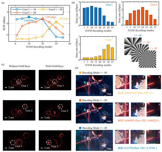 Figure 10b presents a bar chart illustrating the data rates achieved under different OAM keys for three users. The OAM modes encoded in the holograms for these users increase from 10 to 30, from User 1 to User 3, respectively. Correspondingly, the isolation rate between different modes increases. This phenomenon can be attributed to the physical characteristics of the light rings associated with higher OAM modes; specifically, the higher the mode, the larger the diameter of the resultant OAM rings. This results in the failure of the APD to adequately receive signals under incorrect keys due to the dispersion of optical power.