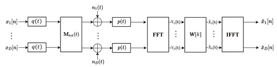 The complex baseband system for an MDM transmission system is shown in Figure 1. Let be the symbol of the d-th mode at the n-th time interval, where . The pulse shaping and electrical-to-optical conversion at the transmitter are given by . The channel response of the MDM system is given by , which can be described by a multi-section model, as given in [19]. The dominant noise source is , which is contributed by inline amplifiers. At the receiver, the optical-to-electrical conversion, along with the electrical filtering, is performed by . By sampling at equally spaced frequencies , where , the frequency relationship of the MDM system can be described by the following: