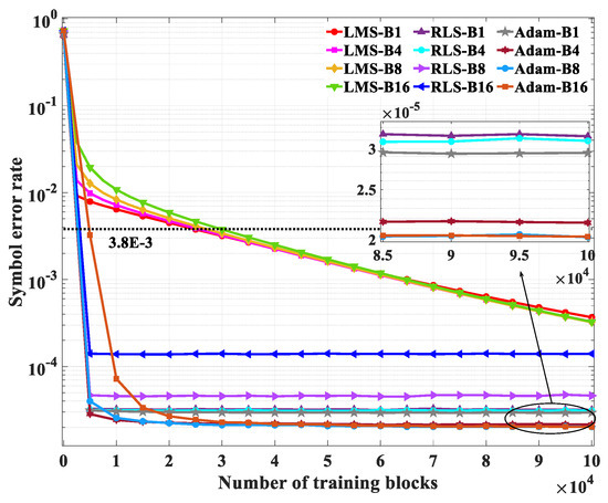 Figure 4 shows the SER versus SNR in dB achieved by the LMS, RLS, and Adam algorithms at for MDL B and B. We chose and for the Adam algorithm for B and B, while was chosen for the RLS algorithm and for the LMS algorithm. As expected, the SER performance of the Adam algorithm was always the best among all the algorithms. For B, the Adam algorithm requires B at the SER of , which outperforms the LMS algorithm by about 1.1 dB and outperforms the RLS algorithm by 0.4 dB. For B, the SNR required for the Adam algorithm at the is B, which is about B better than the RLS algorithm. The SER performance of the LMS algorithm is the worst among all the algorithms.