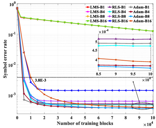 Table 2 shows the number of training blocks of the LMS, RLS, and Adam algorithms with and at the of for B and B, respectively. It can be seen in Table 2 that the Adam algorithm with has the fastest adaption time, where 2500 and 3900 for B and , respectively. The LMS algorithm has the worst adaptation performance in all cases and cannot meet the convergence of the SER of for B. Furthermore, the number of training blocks increases with and as shown in Table 2. If , the number of training blocks increases a little bit higher for the RLS and Adam algorithms as increases.