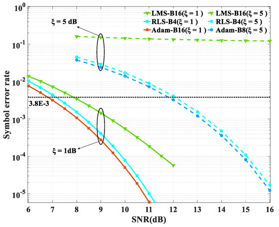 Moreover, the SER performance of the LMS algorithm is almost unchanged when increases and is much worse than the Adam and RLS algorithms, as shown in Figure 2 and Figure 3.