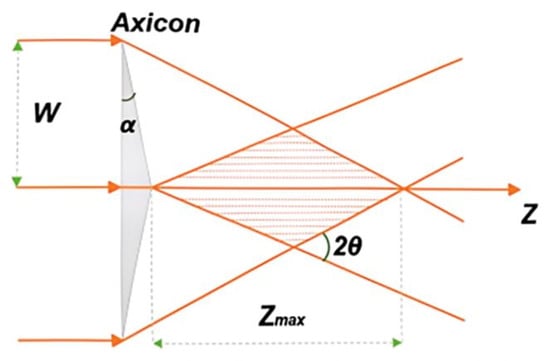 where 2.405 is the independent variable at the first zero of the zero-order Bessel function, k is the wave vector, n is the refractive index of the axicon material, α is the bottom angle of the axicon, and W is the radius of the incident Gaussian beam, as shown in Figure 1.