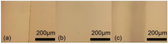 Optical microscope diagram of damage to the backside of quartz glass. Cutting speeds and pulse widths shown are as follows: (a) 5 mm/s, 3 ps; (b) 3 mm/s, 6 ps; and (c) 3 mm/s, 8 ps.
