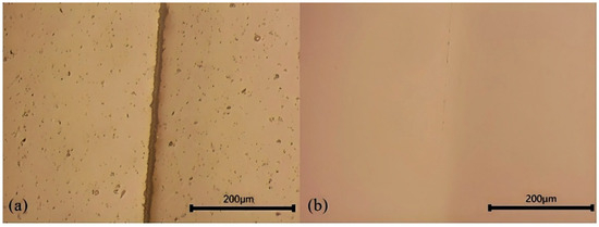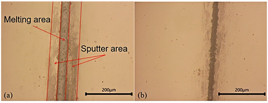 Optical microscope diagrams of quartz glass frontal damage. Cutting speeds and pulse widths shown are as follows: (a) 1 mm/s, 10 ps; (b) 4 mm/s, 10 ps.