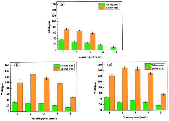 Laser-scanning speed versus melt zone width and sputter zone width for three different backside morphology pulse widths: (a) 2 ps; (b) 6 ps; and (c) 10 ps.