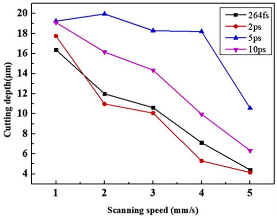 Depth of damage to quartz glass surface versus pulse width and cutting speed.