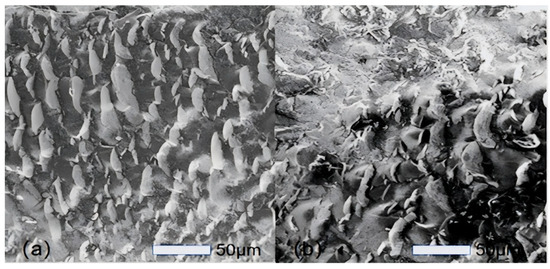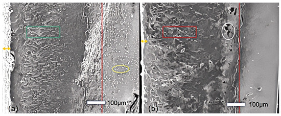 Figure 9 displays scanning electron micrographs of the quartz glass cutting cross-section obtained using a laser pulse width of 5 ps and cutting speeds of 1 mm/s and 5 mm/s. The upper edge of the cutting cross-section, marked by orange arrows, appears smoother compared to the other regions. Additionally, the length of the smooth portion reduced from 49.51 μm to 10.25 μm with an increase in cutting speed. The comb-like structure in the green box formed due to the interaction between the Bessel beam and the high-aspect-ratio quartz glass, which is aligned with the Bessel beam’s direction, as shown in Figure 10a. Columnar structures form as a result of the Bessel beam pulses overlapping at low cutting speeds, causing heat accumulation and re-solidification during quartz glass ablation. The average comb structure size is 34.11 μm. As the cutting speed increased, the comb structure began to shift to an irregularly ablated form, as shown in the red box in Figure 10b, due to the gradual separation of Bessel beam pulses, disrupting pulse connectivity in the irradiated region and leading to a reduction in periodicity. Figure 9a shows white particles in the unabraded area, while microburst cavities, indicated by the white circle in Figure 9b, are visible in the abraded region. This phenomenon is caused by Coulomb explosion and thermal gasification when a Bessel laser interacts with quartz glass [30]. Coulomb explosions form etch pits on a material’s surface. After etch pit formation, laser transmittance decreases, concentrating energy on the surface. This leads to a significant rise in surface temperature above the gasification point, resulting in material vaporization.