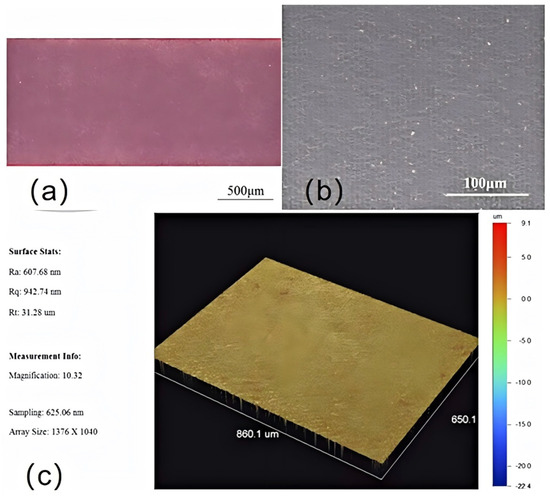 The results of the above analysis permit the determination of the effects of different laser pulse widths and scanning speeds on the cutting quality of quartz glass. Based on the experimental conditions outlined in this paper, the optimal parameters for creating 1 mm thick nano-porous structures in quartz glass using a short-pulse Bessel laser are a repetition frequency of 10 kHz, a laser radiant energy for a single pulse of 200 μJ, a scanning speed of 3 mm/s, and a pulse width of 2 ps. The cutting cross-section of the cut glass samples is shown in Figure 11. The Bessel laser beam passed through the entire cutting cross-section of the quartz glass, and the resulting damage is uniform, with minor chipping or cracking on the side. Furthermore, the roughness of the quartz glass sidewall reached 607 nm Ra.