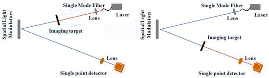 Single-pixel imaging (SPI) is a computational optical imaging technique that has developed rapidly in recent years, showing significant potential for various applications. The concept of SPI originated from experiments in which a single-point detector was used to capture modulated light after optical field modulation. These experiments date back to the 1880s and involved imaging based on point-by-point scanning. Specifically, British researchers developed a scanning-based electronic visual display technique using a selenium cell to detect light intensities that passed through the holes of a Nipkow disk from different spatial locations at different times [1]. As research on area array detectors was not advanced at that time, this technique became one of the primary methods for obtaining two-dimensional images of objects. In 2005, Sen et al. [2] from Stanford University proposed an image acquisition method called dual-photography, which utilized a single-pixel detector to measure the intensity of modulated light. This method can be considered a prototype of SPI. Since then, SPI has evolved into an imaging method characterized by high sensitivity, low noise, a large dynamic range, and low cost. The technique enables high-quality image reconstruction in low-light conditions, acquiring full image information using only one detector. SPI can be divided into pre-modulation SPI and post-modulation SPI according to different light field modulation methods [3]; the specific imaging principle is shown in Figure 1. Although there are some differences between the two imaging methods in the optical path, the imaging principle and reconstruction algorithm are basically similar, so they are both included in the category of SPI techniques.