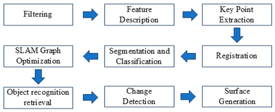 LiDAR systems capture extensive 3D sample points, forming datasets known as point clouds. A point cloud contains the x, y, and z coordinates of the object’s surface relative to the sensor’s position. In some cases, additional information such as color and echo signal intensity is included. Point clouds can accurately describe the geometric characteristics and spatial locations of objects. The basic steps for processing point clouds [65] are illustrated in Figure 5. Point cloud-based surface reconstruction algorithms [66] are presented in the following section, including the Poisson surface reconstruction algorithm and the ball-pivoting surface reconstruction algorithm.