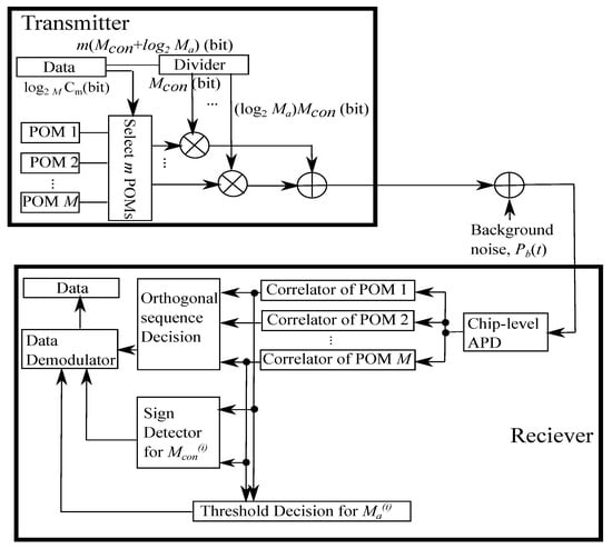 In the proposed system, POMs are selected based on bits of data. The selected i-th POM is concatenated according to bits and the intensity of concatenated code is scaled by , representing its modulation level, where the intensity scaling can be described as a parallel transmission of concatenated part. This structure allows a frame to encode bits of information.