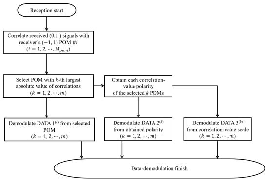 At the receiver, shown in Figure 3, -valued POMs are utilized. The received optical signal is converted into an electrical signal by an Avalanche Photo-diode (APD). The receiver calculates correlation values for each POM and identifies the m POMs with the highest absolute correlations. From these, it extracts data encoded in POM selection, concatenation patterns, and light intensity levels.