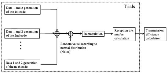 This study evaluates the proposed system’s performance through analysis and simulation. Figure 4 shows the simulation diagram. This study conducted the simulation by Monte Carlo simulation. In the simulation, first, each transmitter generates data bits and transmits them. Then, the simulation multiplies each light intensity of transmission signals by a random value based on a log-normal distribution (i.e., scintillation). Also, the simulation adds a random value based on a normal distribution to those signals (i.e., noise). In other words, the simulation artificially gives scintillation and noise, similar to the references [1,28]. The simulation calculates the data transmission efficiency from the demodulated signal at the receiver. The simulation trials were conducted 10,000,000 times in order to calculate data transmission efficiency. Table 1 shows the parameters which are used in this paper. This paper uses typical APD parameters [1,28]. Parameters in Table 1 are determined according to the values used in [1,28,35].