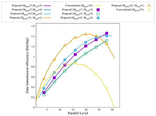 A POM is constructed by extending an M-sequence with one additional chip. In the proposed method, the number of generated POMs is one less than the code length of the POM (i.e., the number of chips comprising the POM). This discrepancy leads to a reduction in data transmission efficiency, particularly when the code length is short, as shown in Figure 9. Furthermore, while the number of additional chips increases as the number of concatenations grows, this effect becomes negligible when the code length of the POM is sufficiently large relative to the number of concatenations.