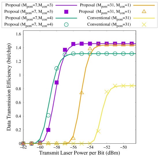 Figure 6 illustrates the relationship between data transmission efficiency and the transmit laser power per bit () for the conventional CSK system and the proposed scheme with light intensity scaling, evaluating the effect of background light noise. Here, the proposed method sets the threshold value to . The evaluation assumes bits. In the proposed scheme, the combinations of are , , , and . Each method sets the number of selected POMs (m) to the number at which the combined transmission reaches its maximum. The solid lines represent the analytical results, while the plots correspond to the simulation results obtained using Monte Carlo simulations. The analytical results are in qualitative agreement with the simulation results, confirming the validity of the analysis. For the conventional CSK system, the frame length is 31 chips, with the number of POMs also set to 31, and the number of bits per frame is given by . In the proposed system, the frame lengths are 21, 28, 30, and 31 chips for , , , and , respectively. As shown in Figure 6, the configuration achieves the highest data transmission efficiency.