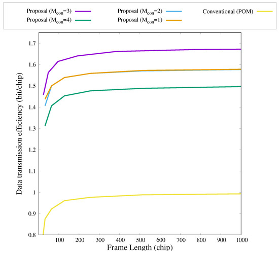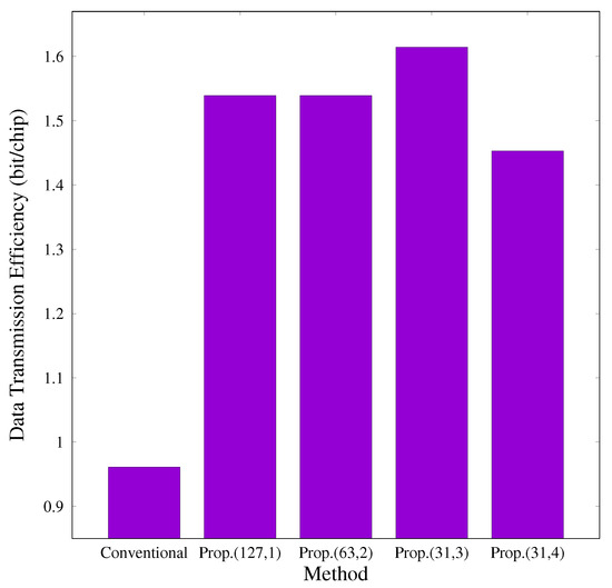 Figure 8 depicts the data transmission efficiency of the proposed and conventional systems. In this figure, the combinations of in the proposed system are (127, 1), (63, 2), (31, 3), and (31, 4). The frame lengths for the cases of (127, 1), (63, 2), and (31, 4) are 128, while the frame length for the case of (31, 3) is 96. Additionally, Figure 9 illustrates the relationship between data transmission efficiency and frame length for both the conventional CSK system and the proposed scheme, where the number of bits per frame increases proportionally with the frame length.