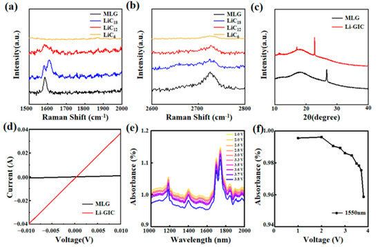 Characterization of MLG and Li-intercalated MLG. (a,b) Raman spectra of MLG and Li-GIC at different stages. (c) XRD test of MLG before (black line) and after intercalation (red line). (d) Four-probe I versus V curves for MLG before (black) and after intercalation (red line). (e) The absorbance spectra as a function of wavelength for MLG at different electrochemical potentials. (f) The absorbance at 1550 nm wavelength as a function of electrochemical potential versus Li/Li+.