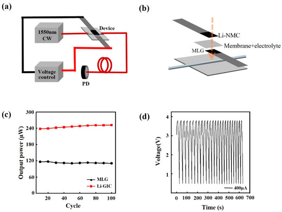 To manipulate the light in the fiber, we integrated the graphene-based Li-ion battery into a fiber laser system, as depicted in Figure 3a,b, with its optical image shown in Figure S1. The light source is a continuous-wave laser with a central wavelength of 1550 nm. The light emitted from the laser is transmitted through the side-polished fiber and modulated by the electrochemical intercalation device, with the output light intensity recorded by the power meter. Through the charge and discharge processes, the output power of the laser can be controlled reversibly, as shown in Figure 3c. The black and red lines represent the output power with no intercalation (measured at 0.5 V) and with intercalation (measured at 3.8 V), respectively. For 100 cycles, the output power of the laser shows at ~120 µW with no intercalation and ~240 µW with intercalation, exhibiting good cyclic stability. Figure 3d shows the relationship between the response time and voltage. During the charge and discharge processes, with a current of 400 µA, the response time is about 1.8 min. After 100 cycles of testing, the modulation range remains nearly unchanged, demonstrating the good stability of the device. For other currents, the outpower and response time are shown in Figure S2. In addition, we exclude the effects of Li-NMC, electrolytes, and membranes on the modulation performance, and relevant experiments and detailed analysis are shown in Figure S3 [41,42,43].