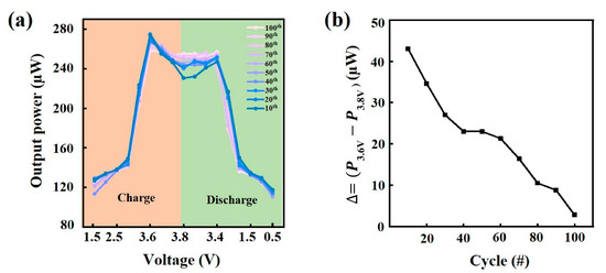 (a) The output power of a laser during charge (orange area) and discharge (green area) for the 10th, 20th, 30th, 40th, 50th, 60th, 70th, 80th, 90th, and 100th cycles, respectively. The current is 400 µA during the charge and discharge process. (b) The difference of output power vs. the number of cycles. The difference of output power between 3.6 V and 3.8 V is extracted from (a).