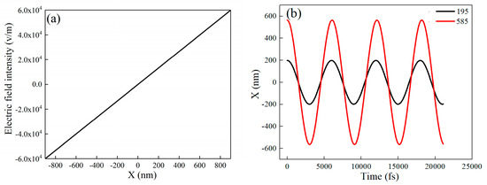 The electrons are accelerated from one side to the center and then decelerated to another side because the symmetric external forces are applied on them when the opposite voltage is applied on the electrode, respectively. The distribution of the electric field intensity under the electrostatic field is shown in Figure 2a, the electric field is in the opposite direction at the side of the 0 position. The trajectory of a single electron located at the position of 585 nm is shown as the red line in Figure 2b. The amplitude ranges from −585 nm to 585 nm. The black line is the electron located at the position of 195 nm, and the amplitude of the electron is between −195 nm and 195 nm. As shown, the amplitude of the electron is closely related to the position of the particle, in other words, the amplitude of the electron depends on its original location under the electrostatic field.