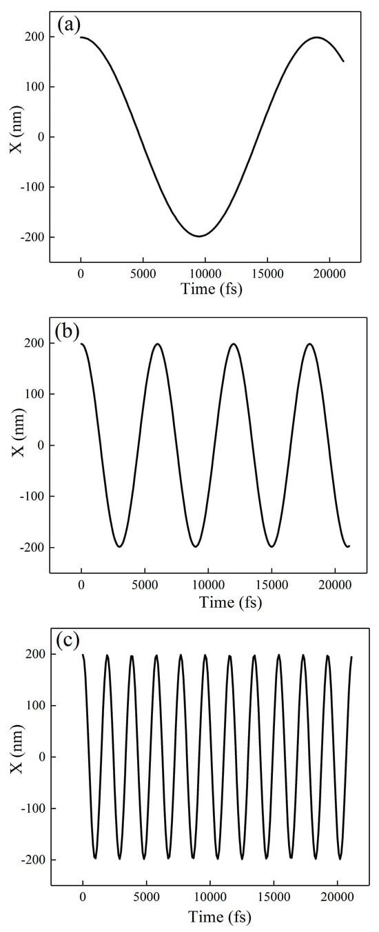 Figure 3a–c show the trajectory of a single electron under the electrostatic field with values of 104, 105, and 106 V/m, respectively, where the X-axis represents the time while the Y-axis represents the position of the electron. It can be observed that the oscillation frequency of the electron varies with the magnitude of the electrostatic field. The electron has a faster acceleration due to the greater force imposed by the electric field, leading to a shift in electron vibration frequency. It can be demonstrated that the vibration frequency of the electron can be controlled by the applied voltage dynamically.